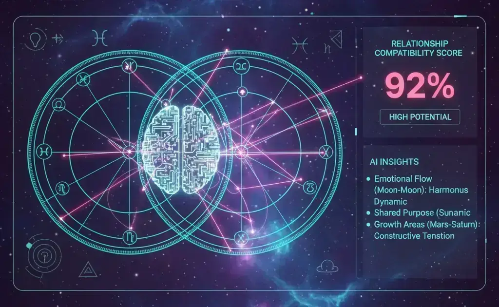 Synastry—the comparison of two birth charts to understand relationship dynamics—has traditionally required hours of manual calculation and interpretation by experienced astrologers. AI-powered synastry analysis transforms this process, using machine learning algorithms to instantly analyze hundreds of planetary interactions, identify compatibility patterns, and provide comprehensive relationship insights.