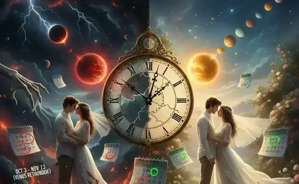 Impact de Vénus Rétrograde: Du 3 octobre au 13 novembre 2026, Vénus—la planète gouvernant l'amour, les relations et l'engagement—semblera reculer dans le ciel. Pendant cette période de 41 jours, l'univers appuie essentiellement sur un bouton de "réinitialisation" cosmique pour les affaires romantiques. Les mariages commencés pendant Vénus rétrograde font souvent face à des malentendus, réévaluation de l'engagement et parfois même des séparations temporaires.